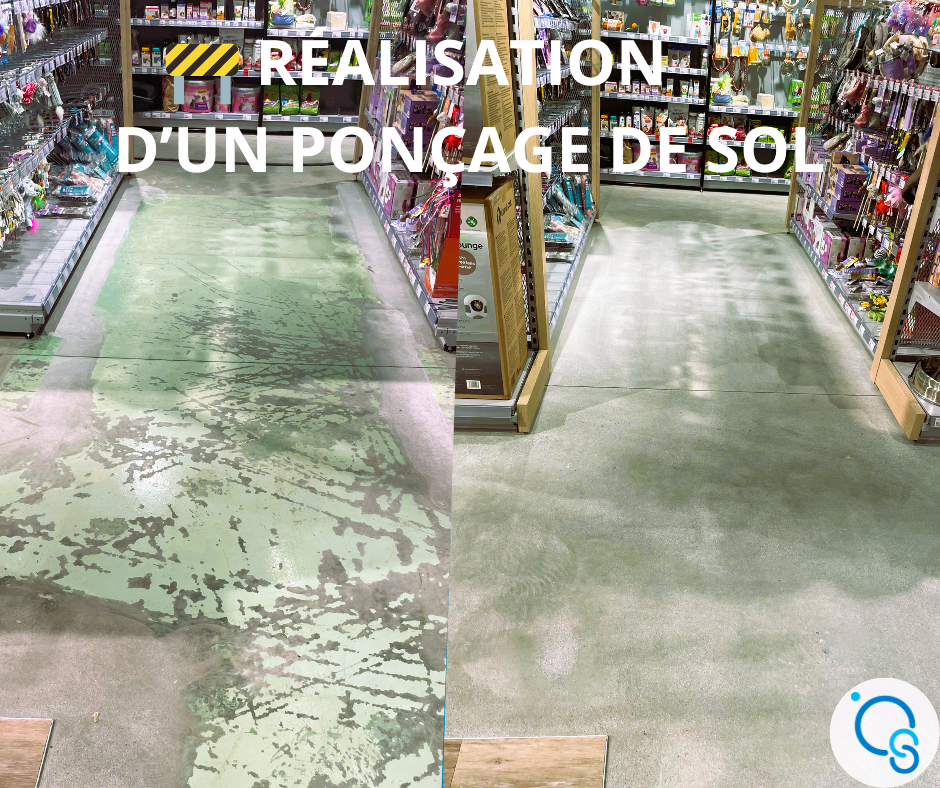 Le ponçage du sol sur toute la surface de vente (600 m2) a été effectué en deux nuits. Une solution choisi pour que ce magasin puisse rester ouvert sans être dérangé pendant ses travaux.